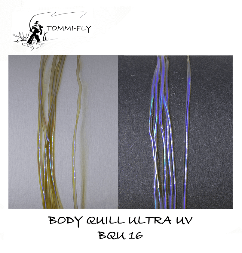 Body quill ULTRA UV se vyznačuje výrazným modro-fialovým leskem a průhlednosti. Struktura materiálu je plochá, což je typické pro přírodní body quill. Díky struktuře se výborně tvaruje na háček, tělíčko se pěkně tvaruje do tenka a následně do kuželu. Modrofialový lesk nepřekrývá původní barvu materiálů, avšak při vrstvení se tón lehce změní. Doporučujeme kombinovat s hlavičkovým lakem. Vhodné na vázání nymfiček a suché mušky.