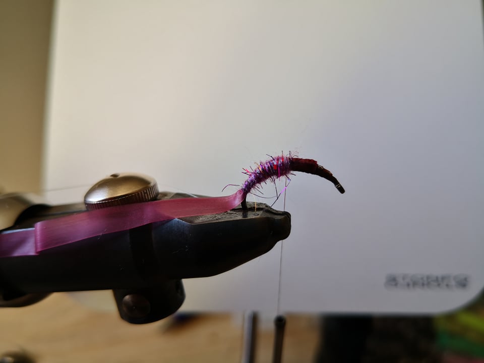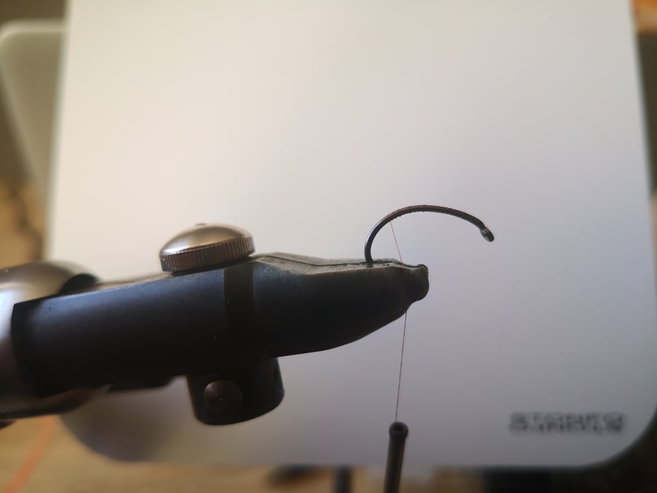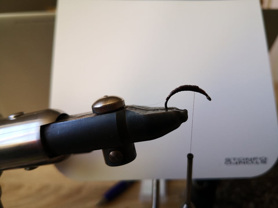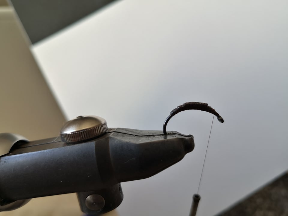 Do svěráčku upneme muškařský háček BLG black vel. 8. Přivážeme hnědou vázací nit TTD nebo MBT (jak jste zvyklý). Nyní shora přivážeme plochý olověný drát, zhruba 2 mm od očka háčku a fixujeme jej až k obloučku háčku. Poté drátek odlomíme a pokračujeme druhou vrstvou, a to opět od očka háčku nyní však začínáme přivazovat cca o 2 mm za začátkem první vrstvy. Fixujeme směrem dozadu k obloučku a končíme opět cca 2 mm před koncem první vrstvy. Tuto operaci zopakujeme ještě jednou se stejným postupem, jako při druhé vrstvě. Jakmile máme hotovou třetí vrstvu, tak přivážeme silon a po silonu Body stretch. Materiály v tomto případě přivazuji shora, zhruba od půlky háčku a fixuji až do obloučku háčku. Nyní začínáme s dubbováním ze začátku dáváme málo materiálu, jelikož muška se zezadu postupně rozšiřuje až do místa, kde je nejvyšší a odtud se zase ztenčuje. Jakmile máme hotové dubbování přetáhneme přes hřbet mušky Body stretch. Materiál musí být natažený a zafixujeme. Po zafixování přebytečný materiál odstřihneme. Nyní uchopíme silon a mušku okroužkujeme. Zajistíme silon vázací nití, zalakujeme a máme hotovo.
