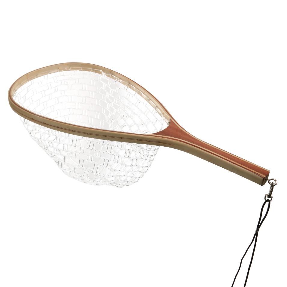 Dřevěný muškařský podběrák s plastovou síťkou.