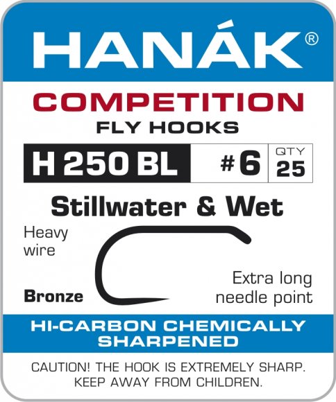 Háčky Hanák H250BL jsou pevné a extra ostré háčky s mimořádně širokým obloučkem, které se hodí pro jezerní a mokré mušky. Tyto háčky byly navrženy ve spolupráci s Mistrem světa i Evropy Lubošem Rozou a jsou považovány za jeden z nejlepších jezerních háčků všech dob. Lze je použít i na mokré mušky, malé streamery nebo suché mušky pro lov trofejních pstruhů. Mají nenápadnou bronzovou barvu a jsou bezprotihrotové.