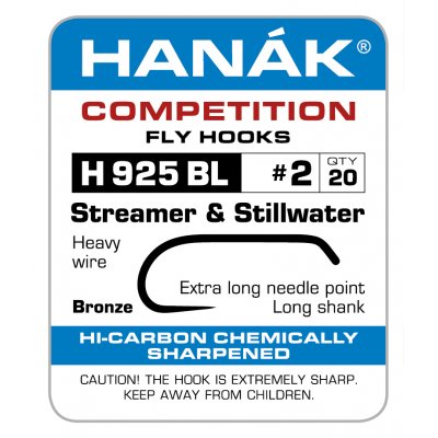 Hanák H925BL ses zesíleným bezprotihrotovmý háčkem a prodlouženým raménkem. Háček je vhodný pro jezerní muškaření, kde je vhodné použít menší velikost, tak i pro streamerování ve větších velikostech.