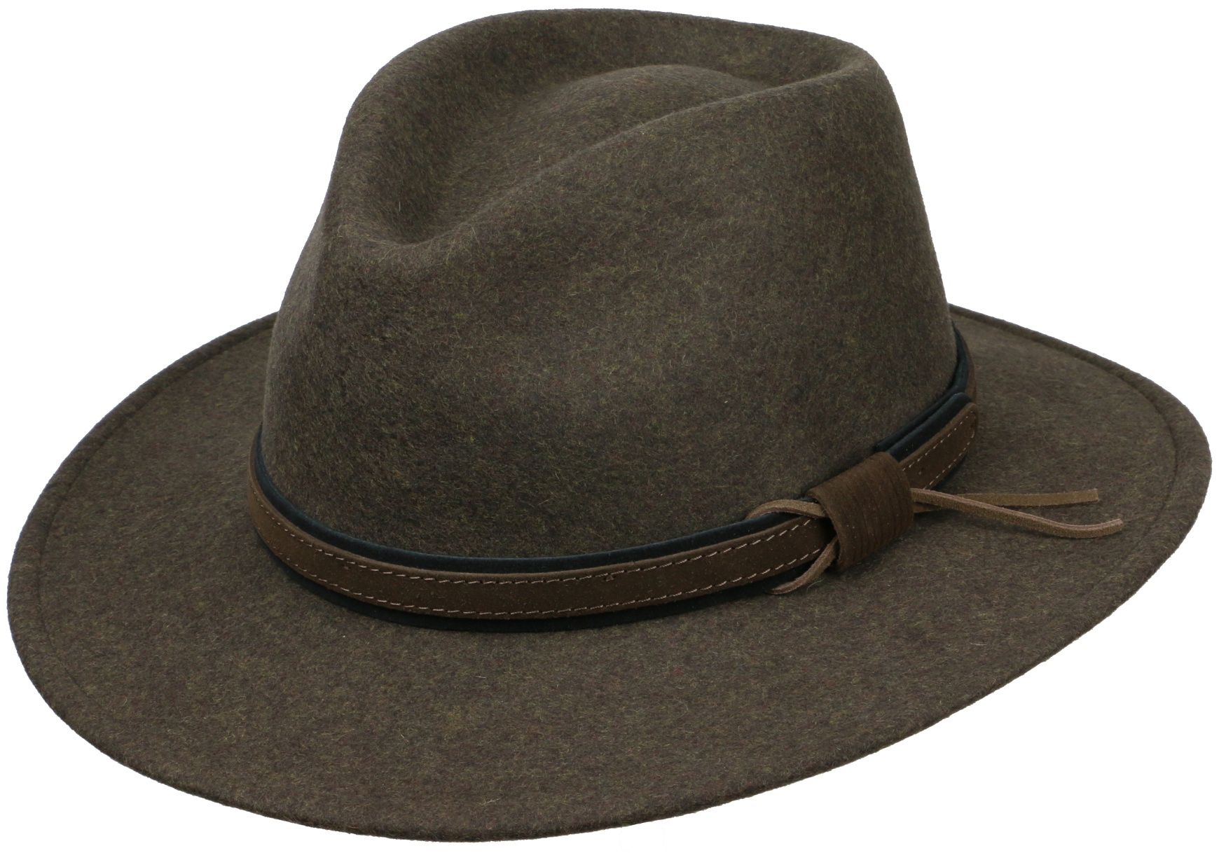Klasický tvar vlněného klobouku s koženým ozdobným páskem, který je prošitý kontrastními švy.