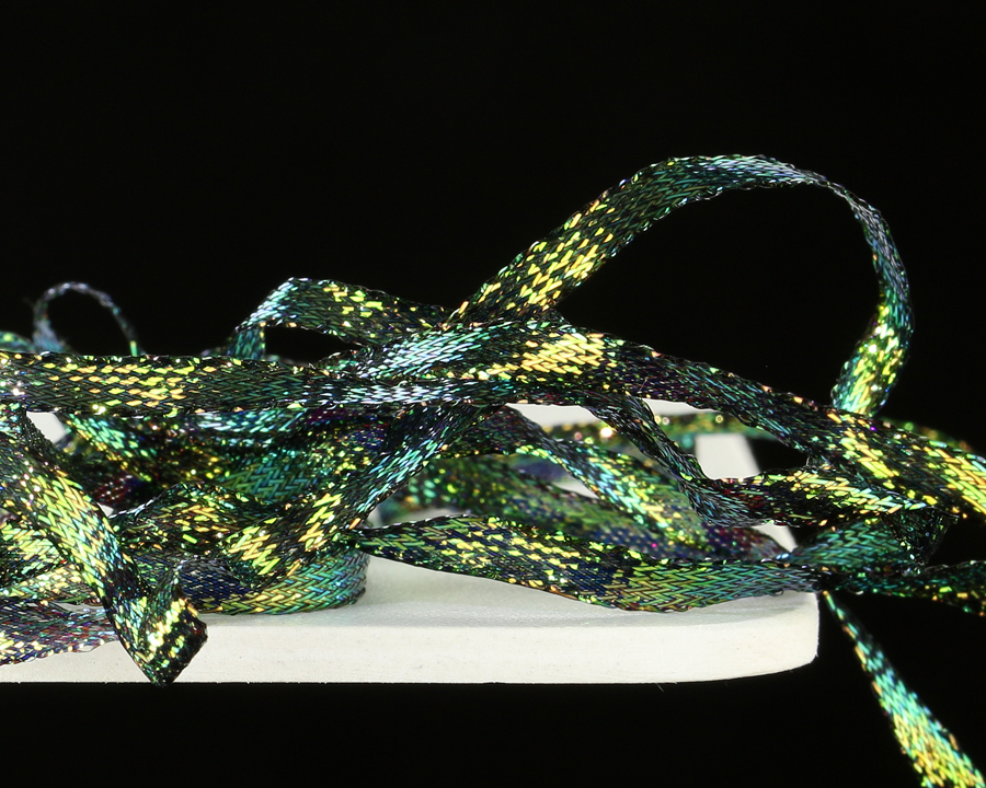 Nová verze pletené stuhy s velmi silným iridiscentním leskem. Vynikající na hřbítky českých nymf, blešivců, kroužkování streamerů a pod. Univerzální šířka cca 3,5 mm.