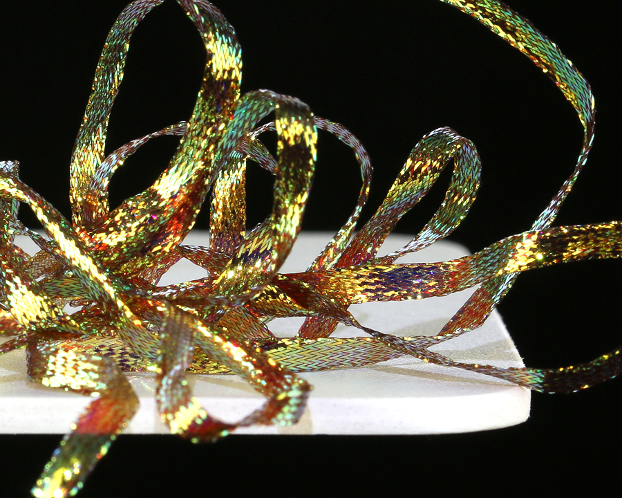 Nová verze pletené stuhy s velmi silným iridiscentním leskem. Vynikající na hřbítky českých nymf, blešivců, kroužkování streamerů a pod. Univerzální šířka cca 3,5 mm.