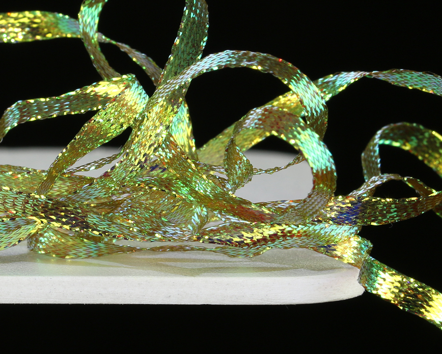Nová verze pletené stuhy s velmi silným iridiscentním leskem. Vynikající na hřbítky českých nymf, blešivců, kroužkování streamerů a pod. Univerzální šířka cca 3,5 mm.
