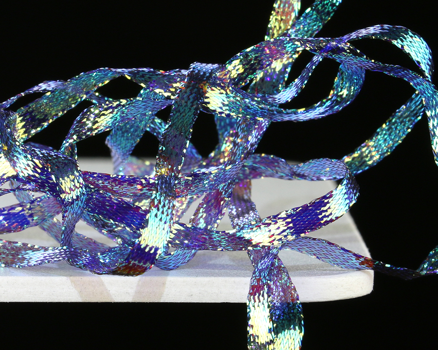 Nová verze pletené stuhy s velmi silným iridiscentním leskem. Vynikající na hřbítky českých nymf, blešivců, kroužkování streamerů a pod. Univerzální šířka cca 3,5 mm.