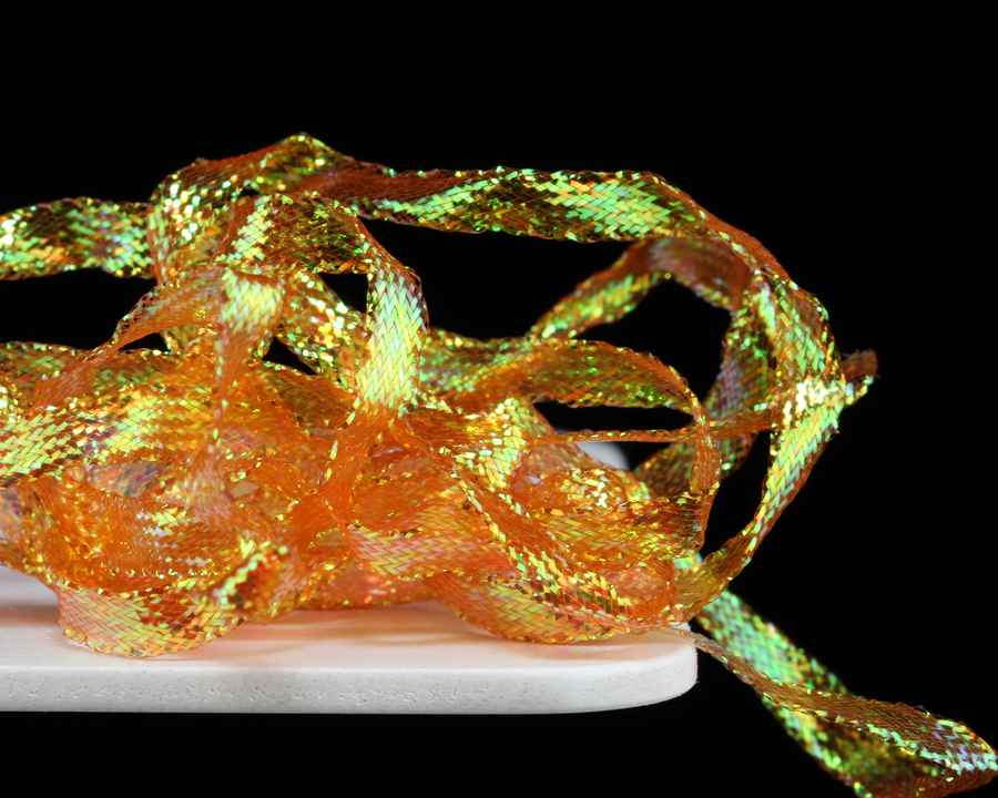 Pletená stuha s iridiscentním leskem. Vynikající pro tvorbu hřbítek českých nymf, blešivců, kroužkování streamerů a podobných vzorů.